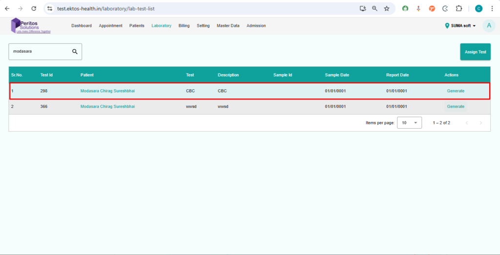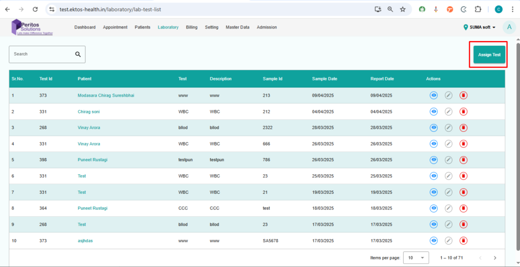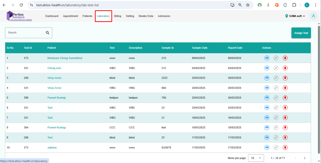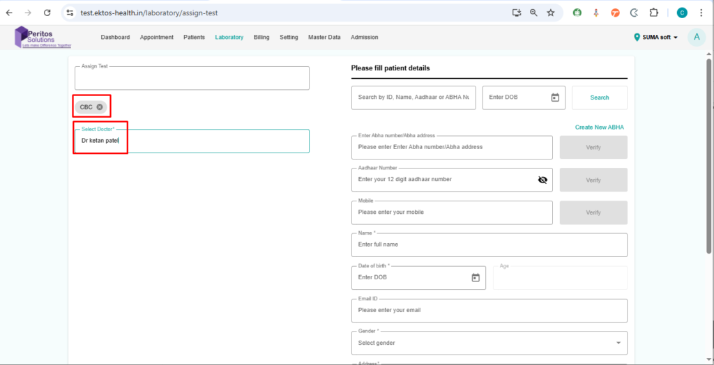 Verify that a user can assign a test to a patient from the laboratory page.